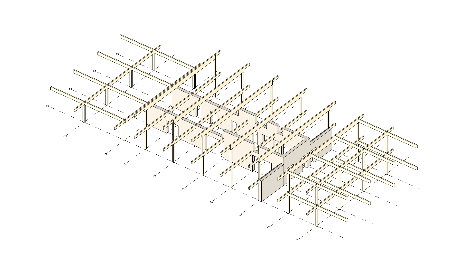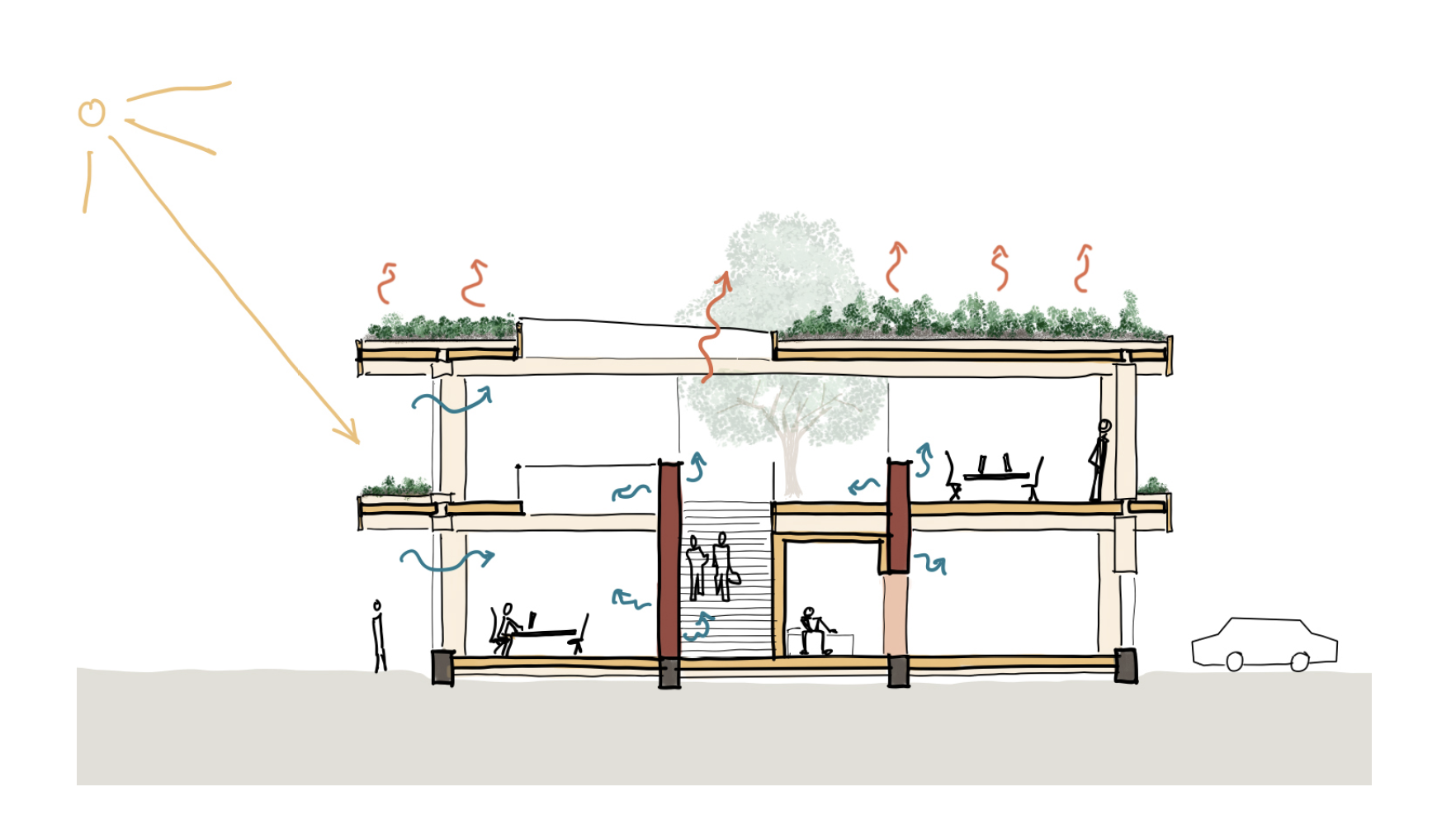 Om een realistisch beeld neer te zetten van de ruimtelijke impact van toepassing van biobased materialen, startten wij met ontwerpen vanuit een referentieproject van een recent teambureau. Door dit project te analyseren en te doorgronden wat de essentie is voor een optimaal teambureau, konden we goed in beeld brengen wat de aanpassing naar een biobased gebouw zou betekenen. We kozen bijvoorbeeld voor een andere stramienmaat, dikkere wanden, meer diepte in de gevel (om gebruik te maken van zon, wind en schaduw) en een andere opzet van installaties.