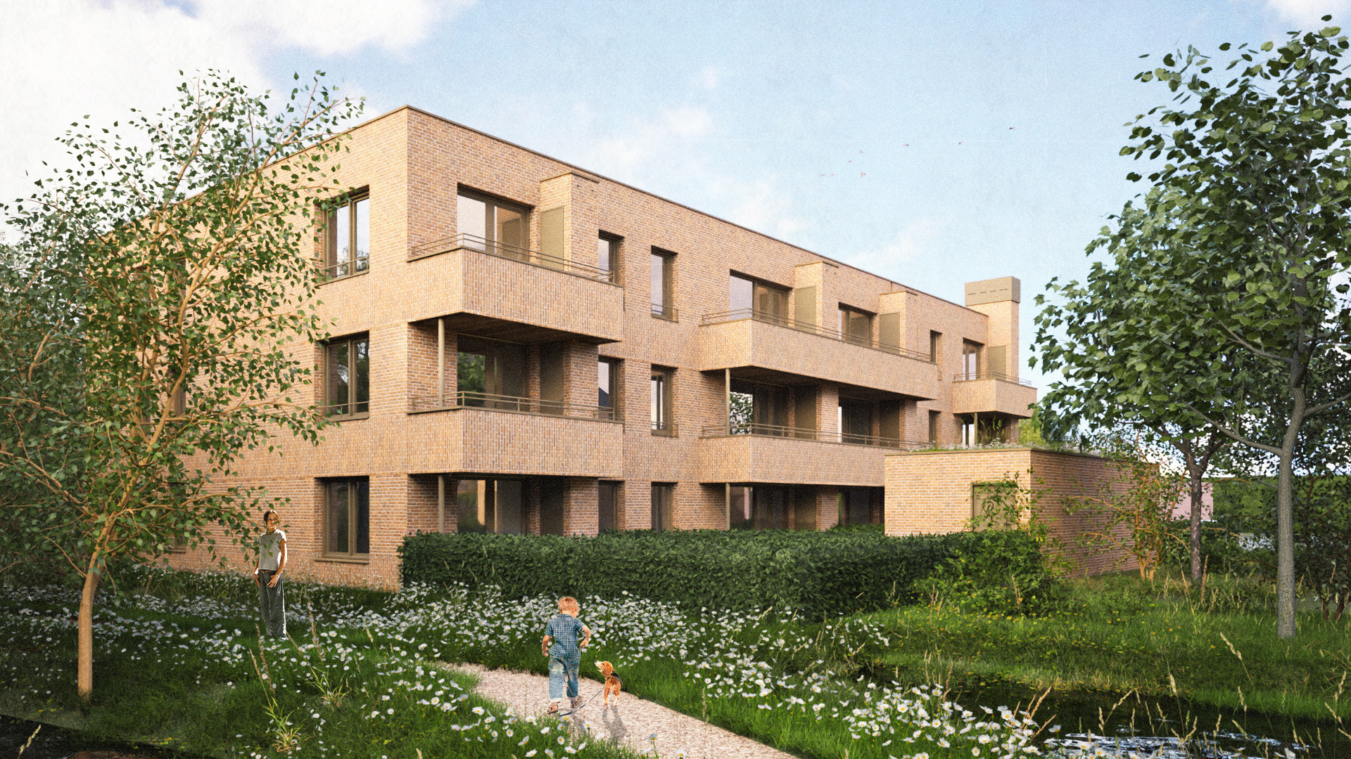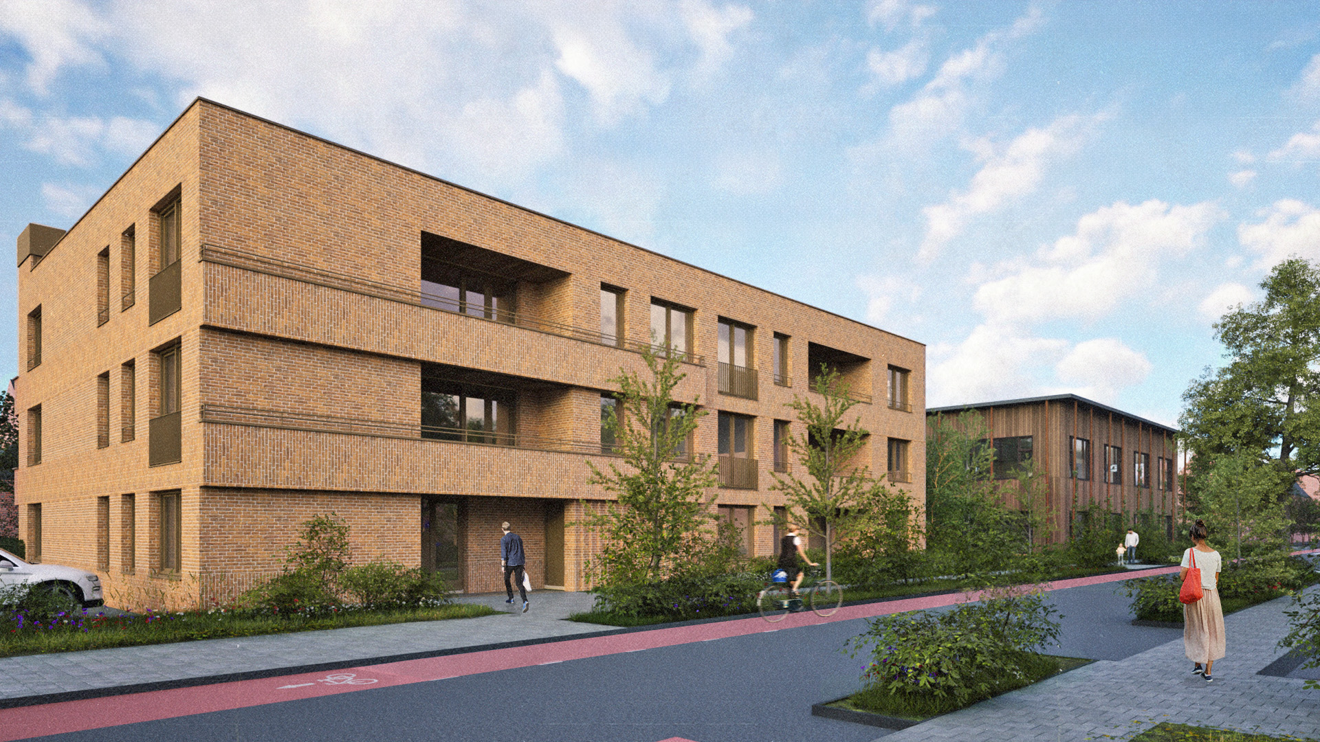 We bouwen in hout met een gevel van ecobrick, een slimme metselsteen met minder volume (35% smaller dan traditionele gevelbakstenen) waar de productie minder energie en grondstoffen vraagt. Door het gebruik van cementarme mortel is hergebruik van de steen in de toekomst mogelijk. De gevel vindt aansluiting op de gemetselde context maar door gewichts- en materiaalbesparing ook op de duurzame ambitie van het project. We voegen groen toe aan de omgeving en op het dak en vangen regenwater op in wadi’s. Nestkasten voorzien de gevel van een natuurinclusieve laag.