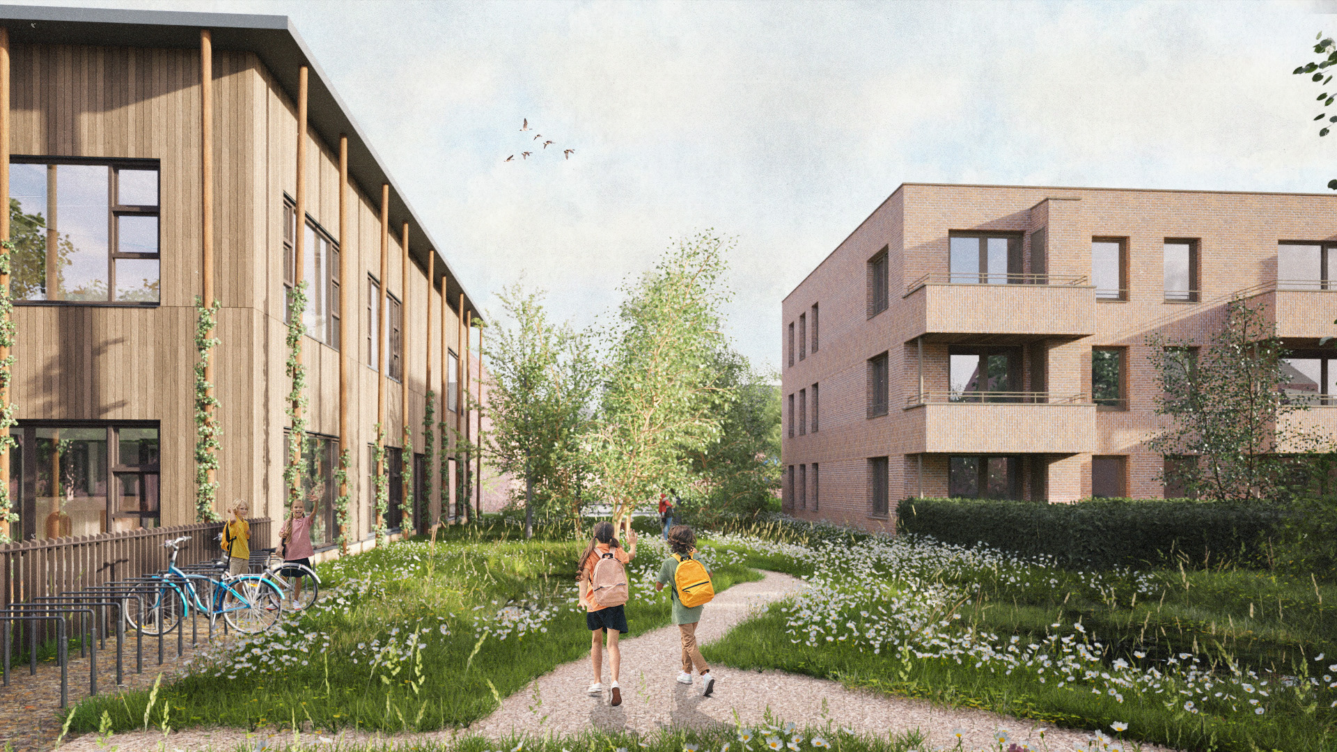 Ook het naastgelegen schoolgebouw, De Nieuwe School, krijgt een houten constructie. Met een gevel van hergebruikt steigerhout en echte boomstammen. Daarmee wordt het een uitgesproken en herkenbaar gebouw in de wijk.