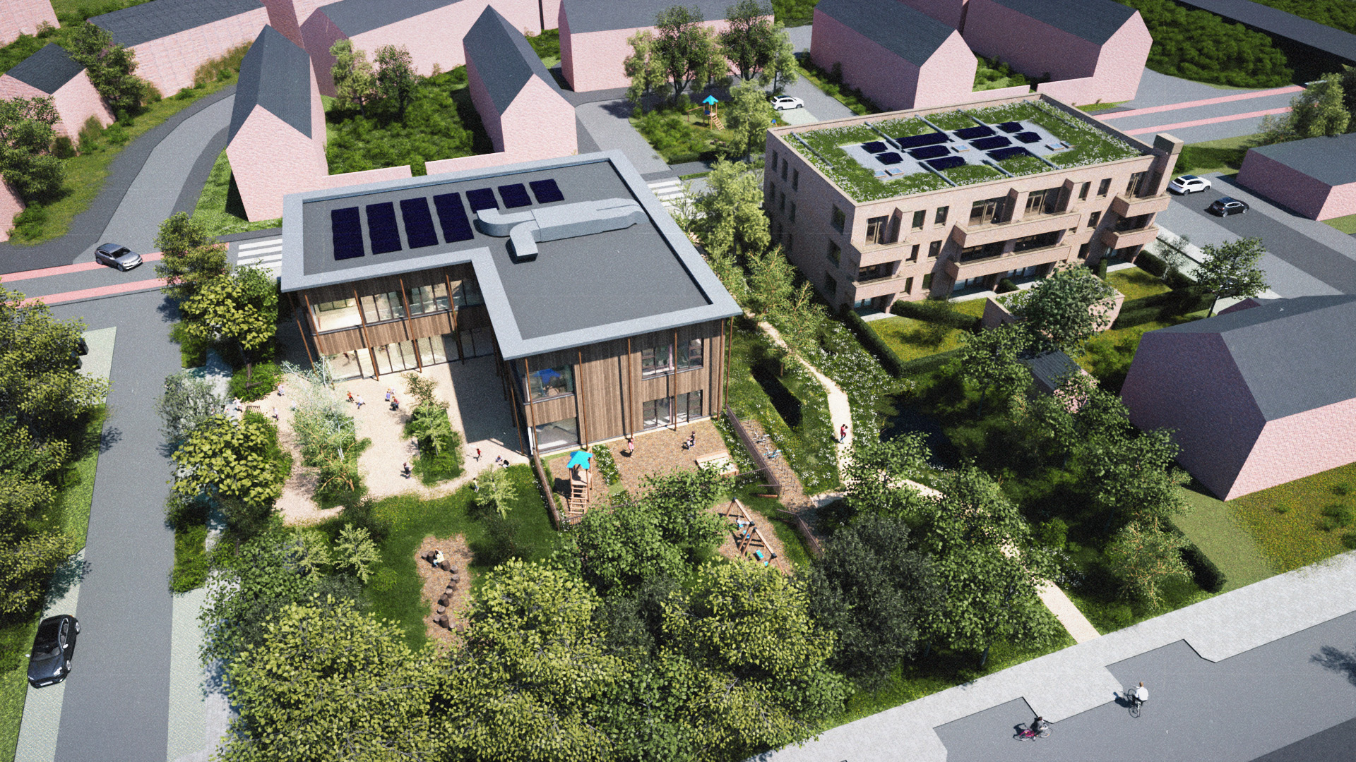 De ateliers zijn verbonden met een lichte klimaatzone die als leerplein fungeert. Grote vouwpuien openen naar de schooltuin, waardoor binnen en buiten letterlijk in elkaar overlopen. Het speelplein is een groene, natuurlijke omgeving die uitnodigt tot ontdekken, lekker te bewegen en samen te spelen. Regenwater wordt zichtbaar afgevoerd en langzaam teruggegeven aan de bodem via wadi’s.