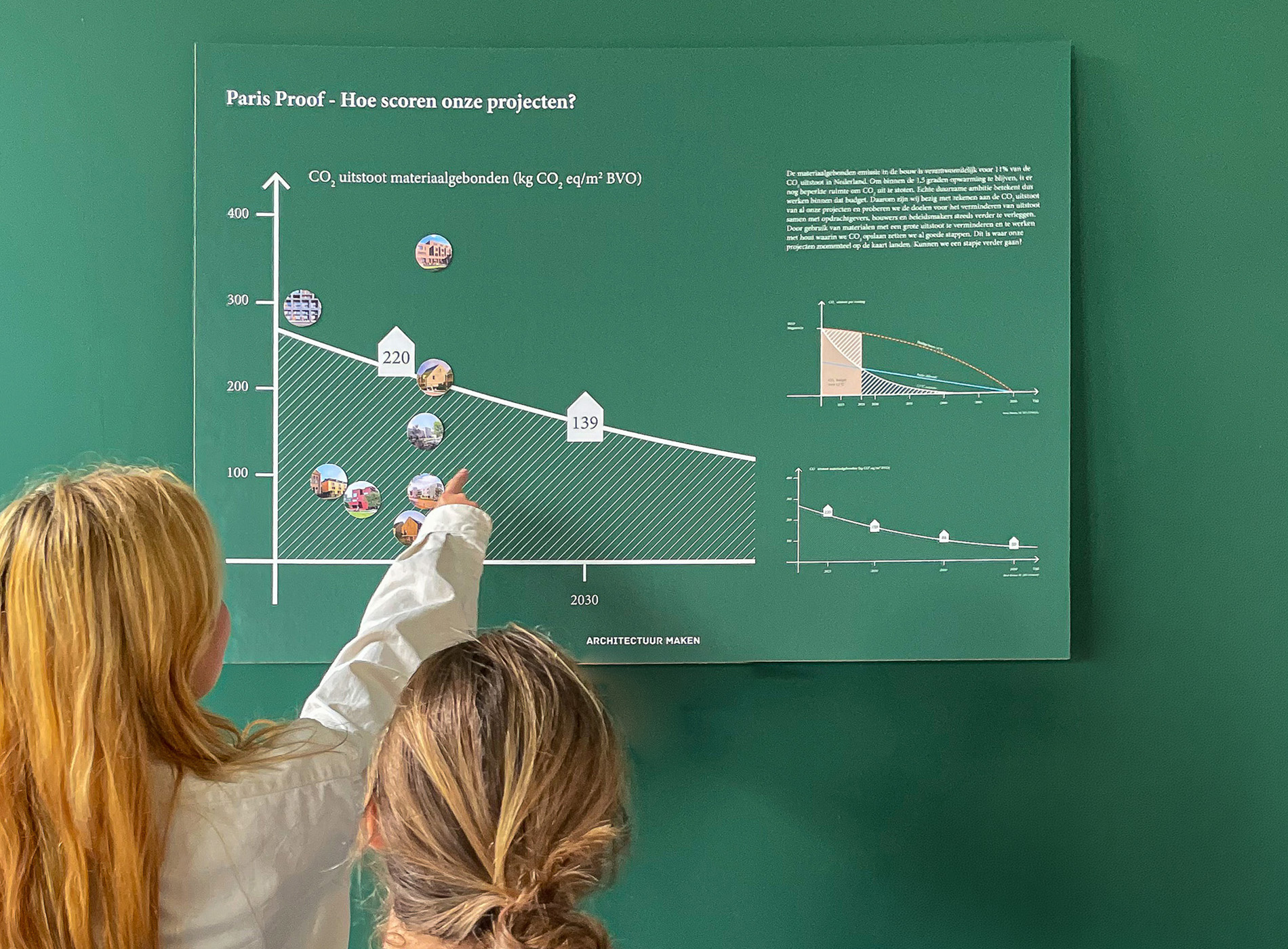 Ongeveer driekwart van die uitstoot komt voort uit het gebruik van onze gebouwde massa (de operationele emissies). Een kwart (circa 11% van de globale CO2 emissies) is de materiaalgebonden emissie. Dit bevat alle uitstoot die voortkomt uit de productie, constructie, het onderhoud en de vernieuwing van de materialen die we gebruiken voor het bouwen van onze ontwerpen.