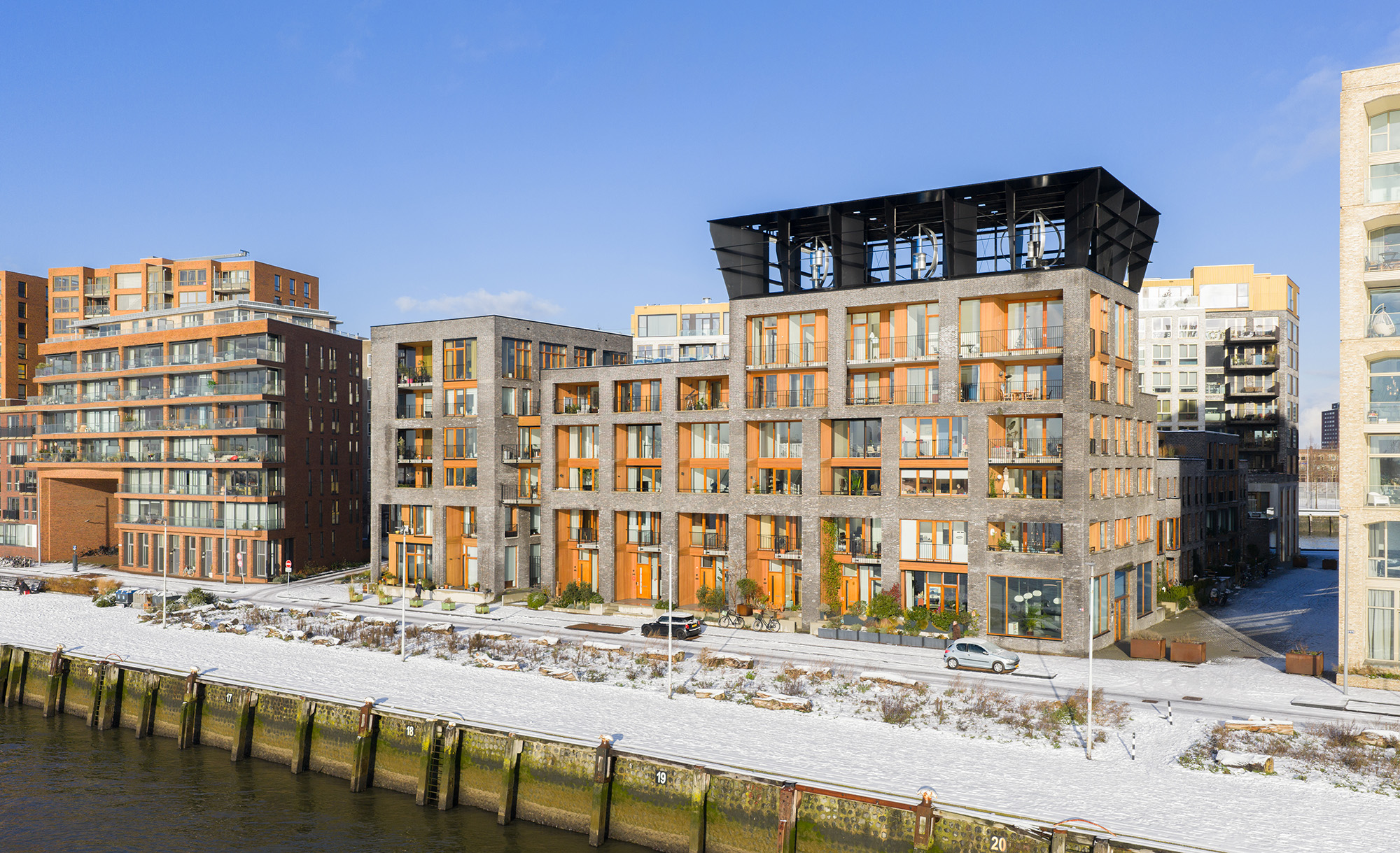Bovenop de appartementen aan de Maas staat het Powernest. Het is voor het eerst dat deze op een nieuw woongebouw is toegepast. De windturbines en PV-panelen in dit ‘nest’ voorzien het hele bouwblok van energie. Daardoor kon er meer dakoppervlak vrijgehouden worden voor groen, dakterrassen en de opgetilde woonstraat waaraan bewoners van gezinsappartementen elkaar ontmoeten.